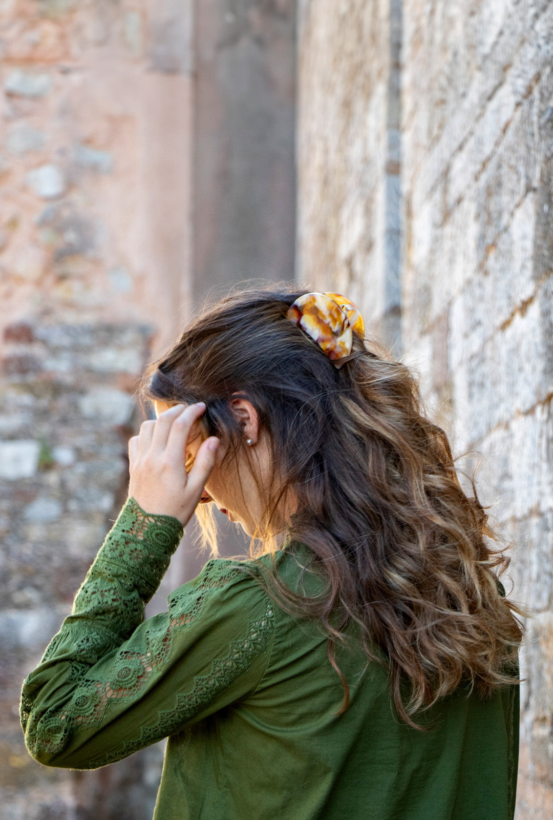 The Italian Tortea barrette is ideal for wearing on a ponytail. Made of cellulose acetate, this barrette embodies elegance with its modern tortoiseshell shades, available in cream, green, orange, as well as two limited editions in blue and pink. Its design ensures a perfect hold throughout the day, while adding a sophisticated touch to your hairstyle.